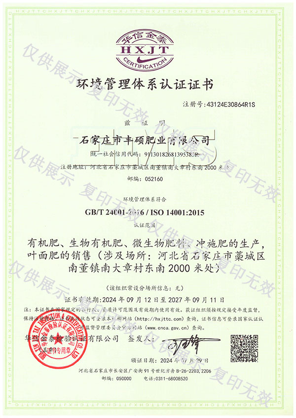 石家莊市豐碩肥業有限公司是一家集新型肥料的研發、制造、營銷、服務于一體的高新技術企業,公司自2008年創辦以來,一直致力于新型肥料的技術研發和市場推廣。公司組建了豐碩新型肥料研究中心(院士專家企業工作站),自主知識產權研發團隊專業科研人員20余人,獲得了多項肥料國家發明專利。公司目前已擁有發酵類有機肥、微生物菌劑、生物有機肥、土壤調理劑、大量元素水溶肥、含腐植酸肥料、含氨基酸肥料、中微量元素肥料等8大品類,“金維克”、“豐碩沃農”等2大自有品牌,擁有20多個暢銷品種。目前,我公司已經通過了“ISO9001 質量管理體系認證”、“ISO14001 環境管理體系認證”、“OHSAS18001 職業健康管理體系認證”。...